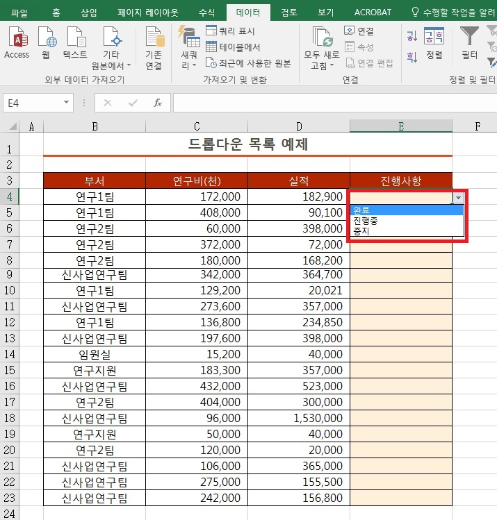 아래 사진을 보시면 완료, 진행중, 중지가 포함된 드롭다운 목록이 만들어 진 것을 보실 수 있어요. 유효성 검사 창을 활용하면 정말 간단하게 만들 수 있습니다.