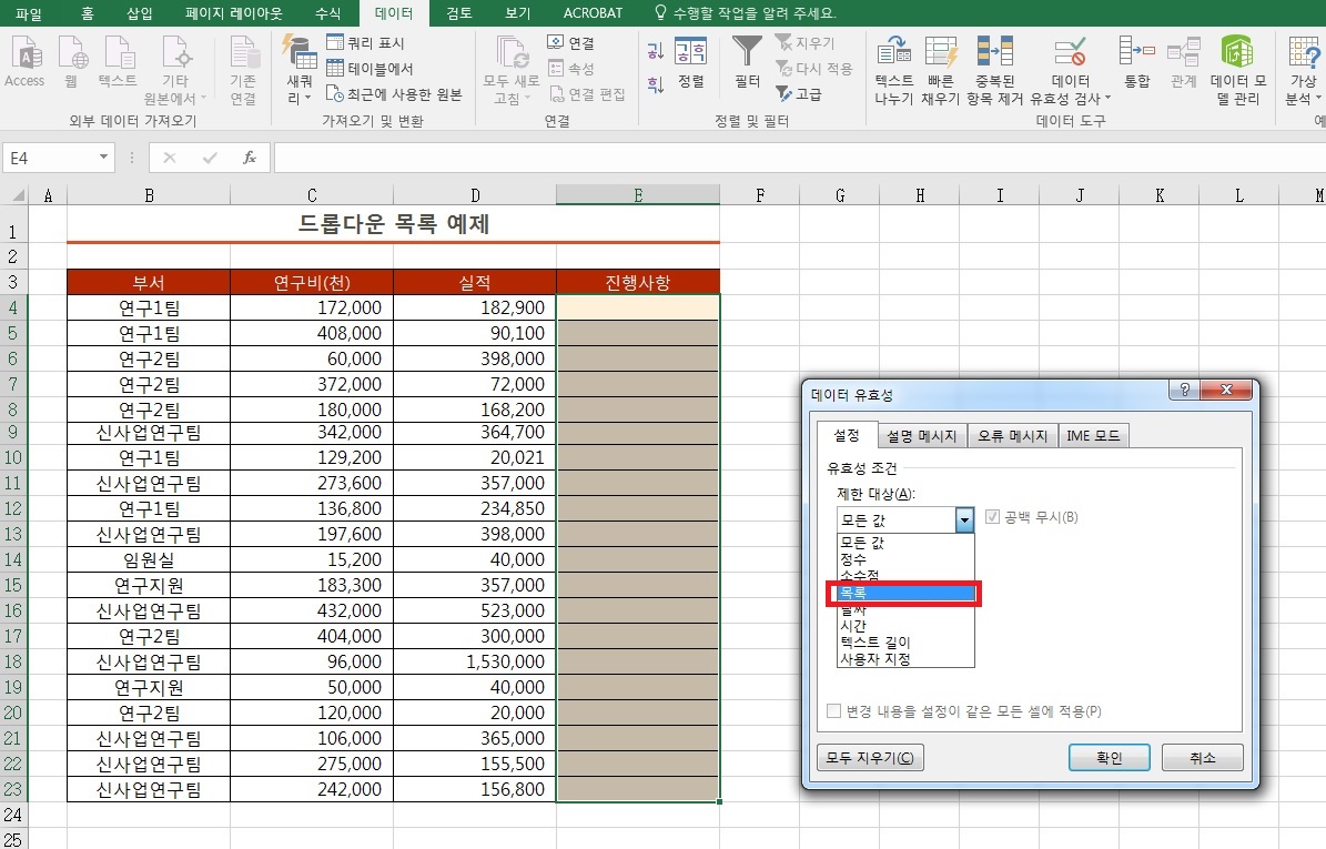 데이터 유효성 창에서 [제한대상]-[목록]을 선택해주세요.