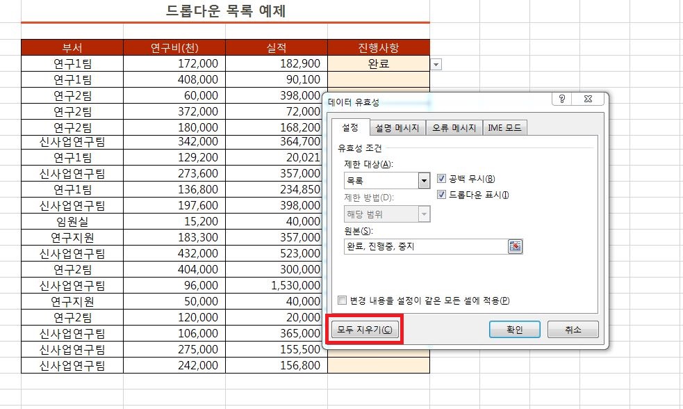 데이터 유효성 창에서 모두 지우기를 클릭해주시면 모두 삭제가 완료됩니다.
