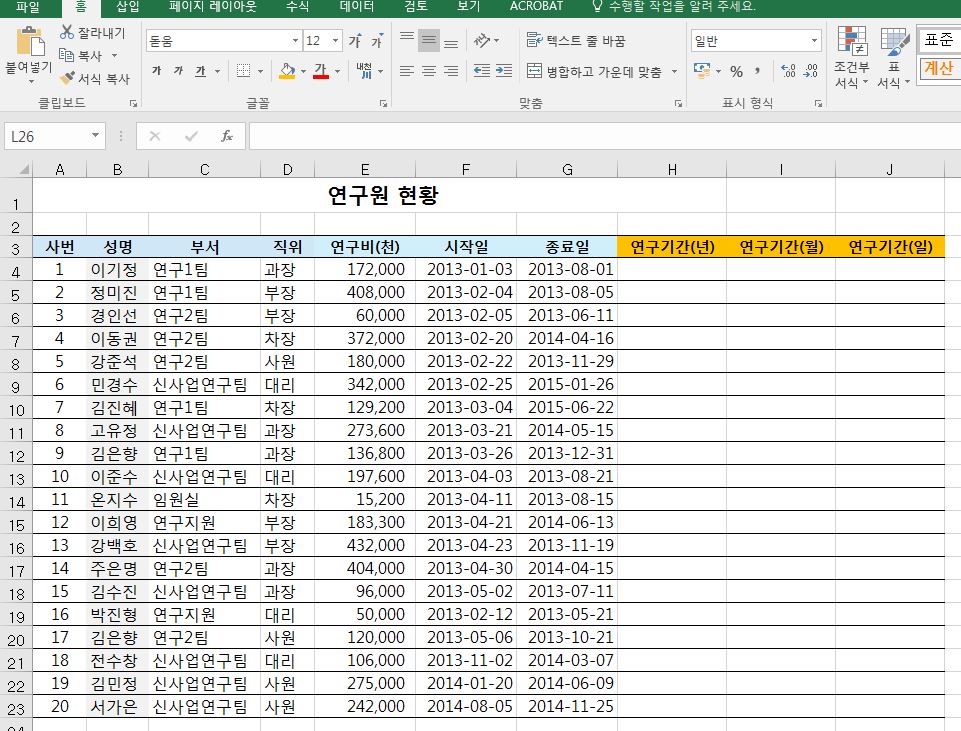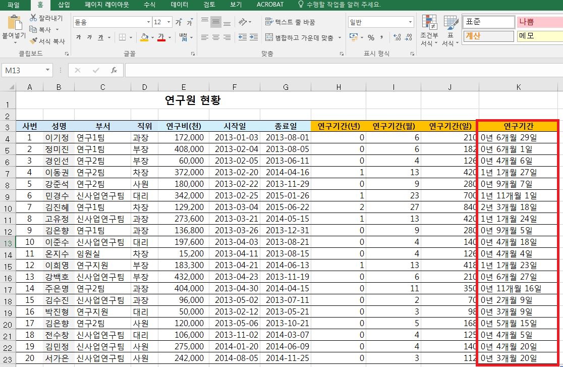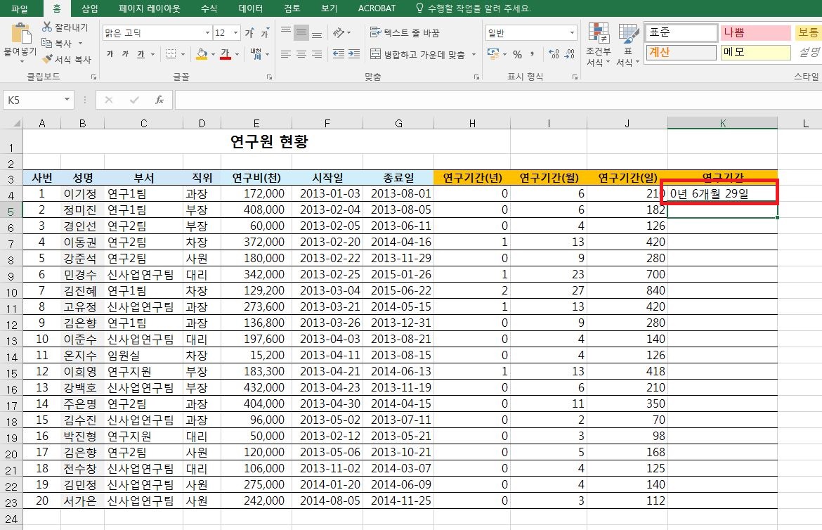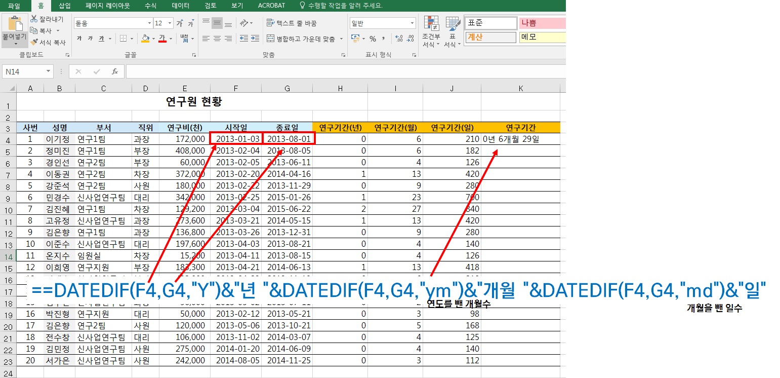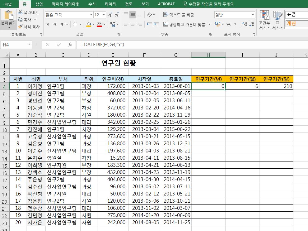 datedif 함수를 활용하여 최종적으로 아래와 같이 연구기간을 얻어낼 수 있습니다.