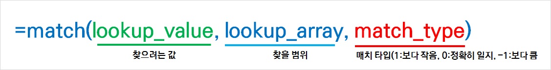 사실 Match_type는 잘 사용하지 않습니다. 대부분 같은 값의 위치를 찾고자 하기 때문에 활용도는 떨어지지만 어느 정도 이해만 하고 있으면 좋을 거 같습니다. 같은 값만 찾을 경우 0을 입력하지 않고 공백으로 둬도 기본값인 0이 입력된답니다.