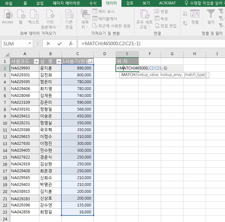 아래 예제에서처럼 465000보다 크거나 같은 값 중 최솟값인 1사 분기(천 원)의 위치를 찾아보겠습니다. =Match(465000, C2:C23, -1)를 입력합니다.