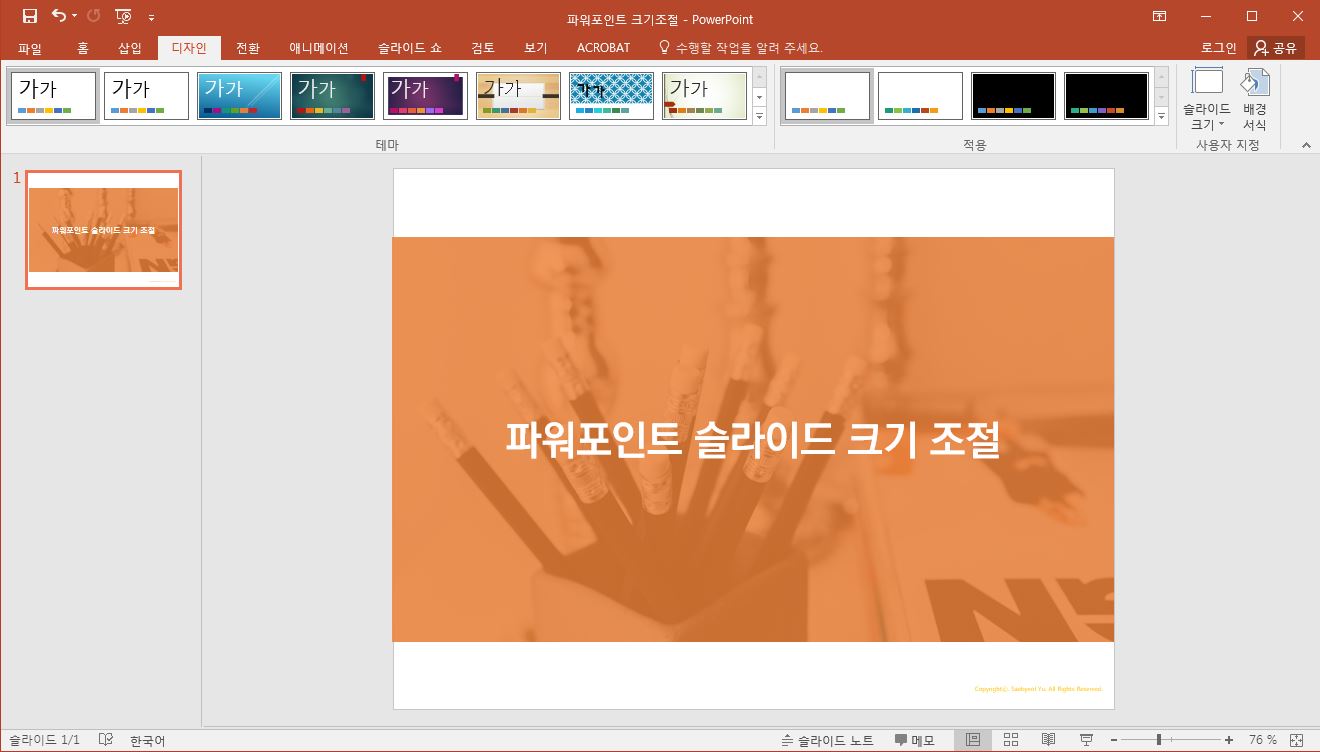 이렇게 쉽게 슬라이드 크기를 조절할 수 있어요. 어렵지 않지만 알아두면 좋은 방법이에요.