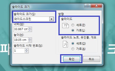 슬라이드 크기 창에서는 크기, 슬라이드 방향 등을 설정할 수 있습니다. 그 외에도 너비와 높이도 세세하게 설정할 수 있습니다.