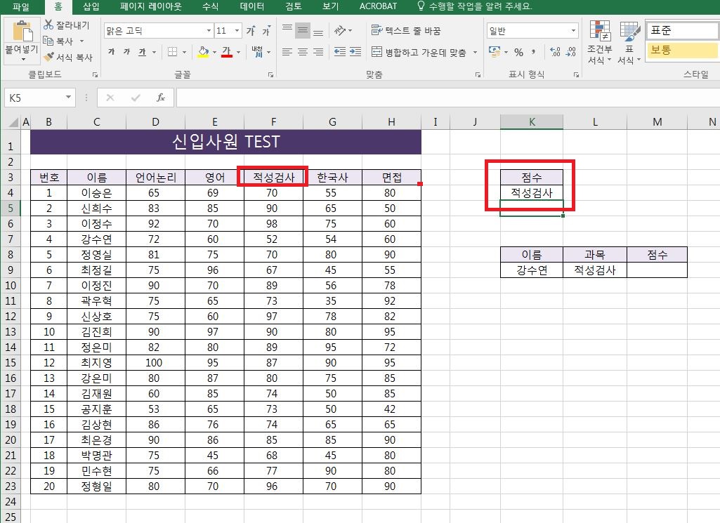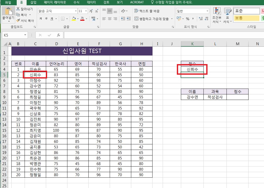 찾을 범위 열의 위에서 세 번째 값인 "신희수"가 출력되는 것을 볼 수 있습니다.