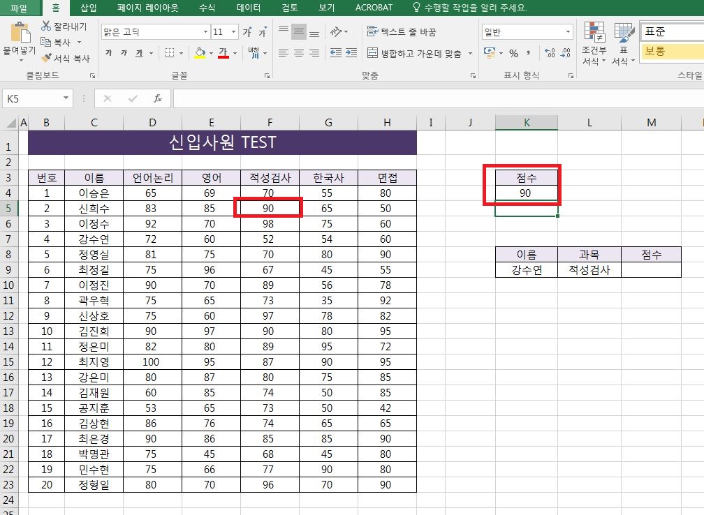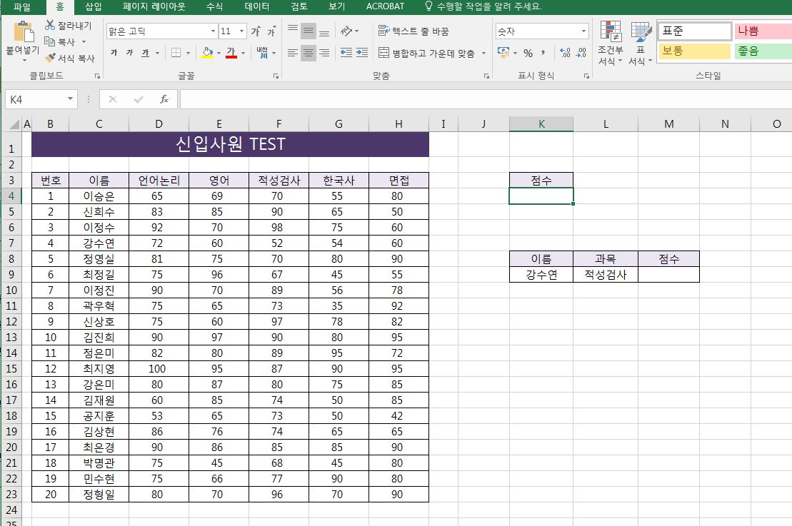 위 예제처럼 아래에 이름, 과목에 따른 점수를 찾는 함수를 index와 match 함수를 조합하면 사용할 수 있습니다. 자세한 사용법은 활용 방법 글에서 알아볼게요.