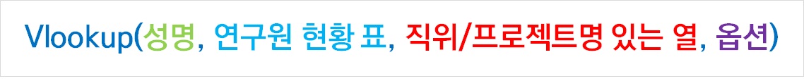 세 번째 col_index_num은 찾을 영역에서 가져올 값이 있는 위치를 적어주면 됩니다. 직위의 경우 성명에서부터 3번째라서 3을, 프로젝트명은 5를 입력하면 됩니다.
