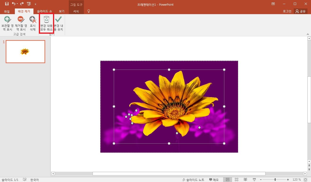 배경이 제거된 후 다시 원래대로 돌릴 수도 있어요. [변경내용 모두 취소]를 클릭해주면 됩니다.