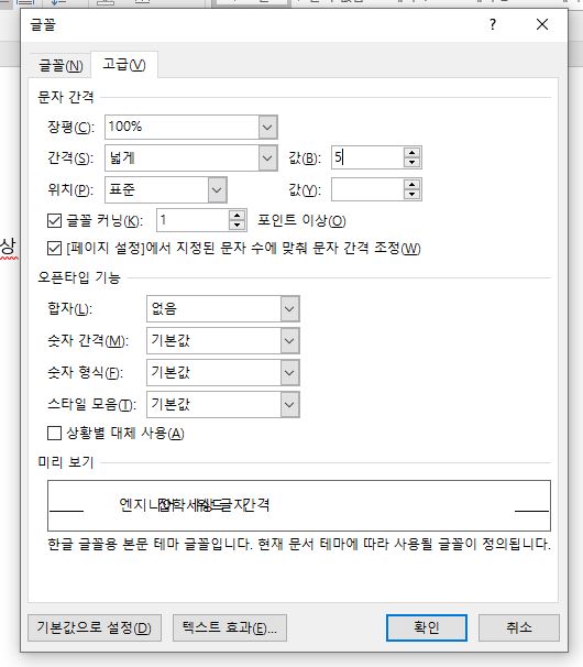 상단 메뉴 중 고급을 선택하면 간격과 값이 있어요. 간격은 넓게하고 값은 5로 바꿔볼게요. 간격은 표준, 넓게, 좁게 세가지가 있어요. 간격에 따른 값을 지정하는 것이에요.