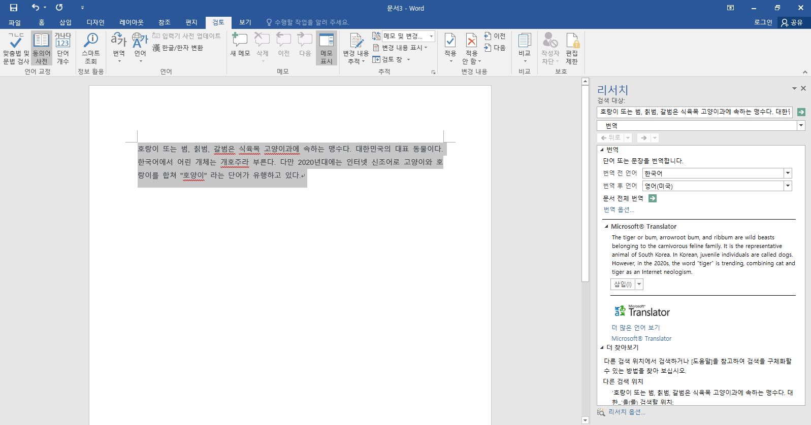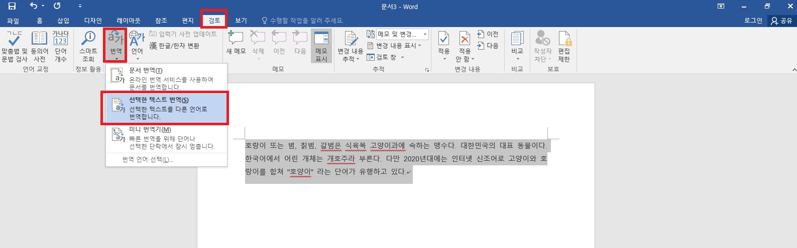 그 다음 원하는 문장을 선택한 다음 상단 메뉴에서 [검토]-[번역]-[선택한 텍스트 번역]을 클릭해주세요. 문서 전체를 번역하고자 하지면 문서 번역을 클릭해주시면 되요.