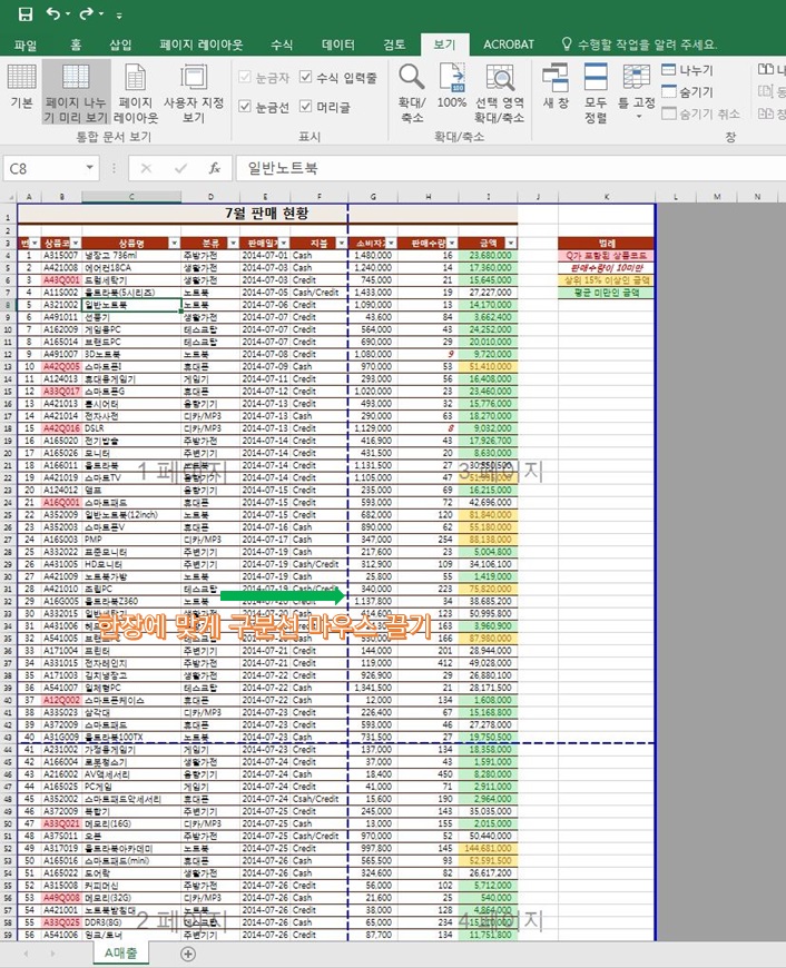 먼저 [보기]-[페이지 나누기 미리보기]를 클릭한 다음에 마우스로 아래 이미지와 같이 나타난 구분선을 한장에 맞게 조절합니다.