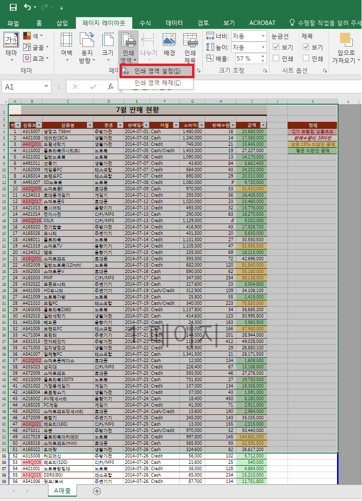 특정 영역만 인쇄하고 싶을 때 인쇄영역설정으로도 가능합니다. [페이지 레이아웃]-[인쇄영역]-[인쇄 영역설정]으로 원하는 범위를 선택할 수 있습니다. [인쇄 영역 해제]로 영역 설정을 모두 취소할 수 있습니다.