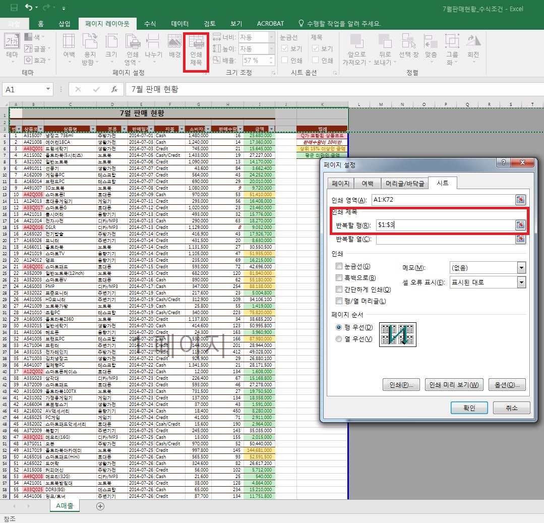 여러 페이지로 이루어진 경우 각 페이지에 행 및 열 머리글이나 제목을 반복해서 출력할 수 있습니다. [페이지 레이아웃]-[인쇄제목]-[반복할 행 또는 반복할 열] 상자의 오른쪽 끝에 있는 아이콘을 클릭하여 원하는 행 또는 열을 선택합니다.