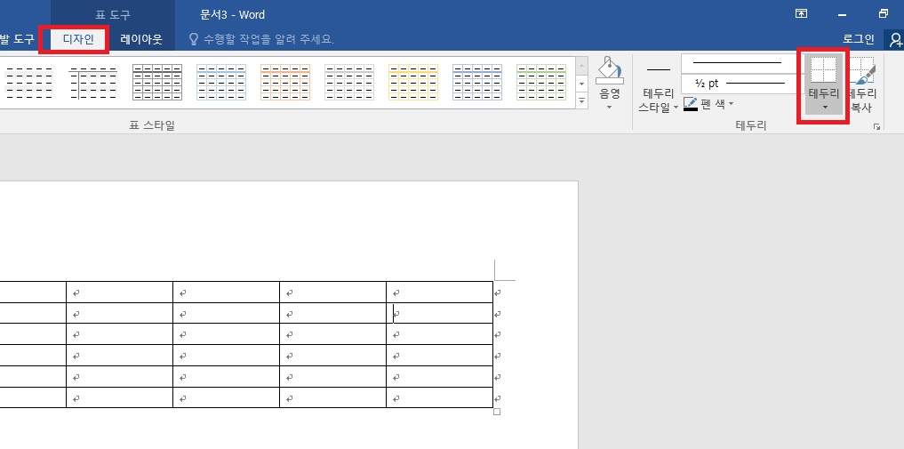 표를 선택한 다음에 디자인에 들어가면 테두리가 있어요. 테두리를 클릭해주세요.