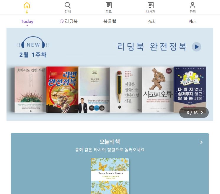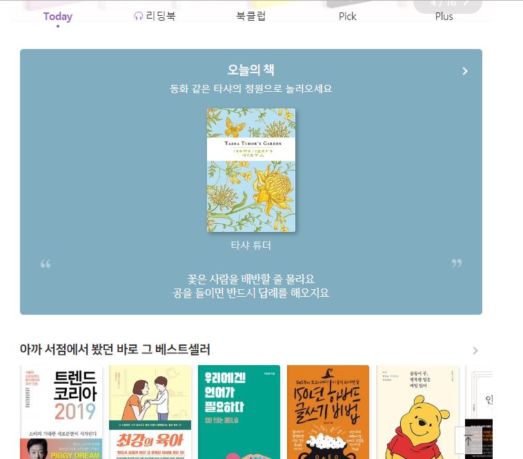 매일 오늘의 책을 추천해주고 다양한 베스트 셀러도 메인페이지에서 쉽게 볼 수 있도록 홈페이지가 구성되어 있어서 책을 좋아하신다면 한번 이용해보시면 좋을거같아요.