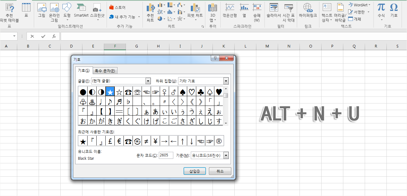 특수문자(기호) 단축키는 ALT+N+U를 누르면 됩니다. 아주 간단하죠? 메뉴를 찾아갈 필요가 전혀 없습니다.