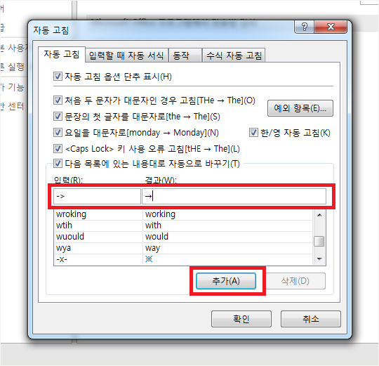 아래에 입력에 단축키(->)를 작성하고 결과에 특수문자(→)를 넣어준 다음 추가를 클릭하면 끝납니다.