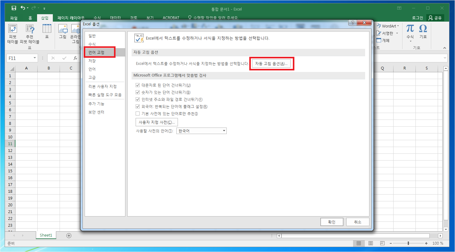 자주 쓰는 특수문자의 경우 일일이 기호에서 찾아가며 넣는 것은 사실 번거롭습니다. 그래서 엑셀은 자주쓰는 특수문자를 단축키로 지정해서 사용하는 기능을 제공합니다. 먼저 파일-옵션-언어교정에 들어간 다음 [자동 고침 옵션]을 클릭합니다.