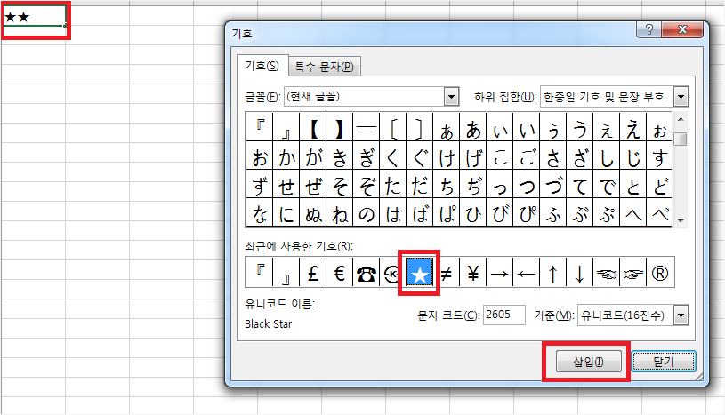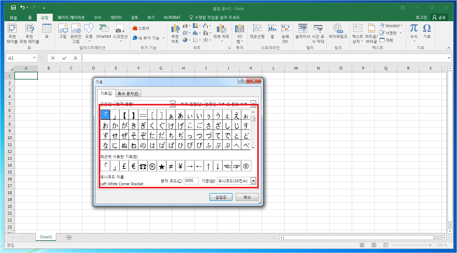 그 후 필요한 기호를 선택한 다음 삽입을 클릭하면 특수문자를 넣을 수 있습니다.