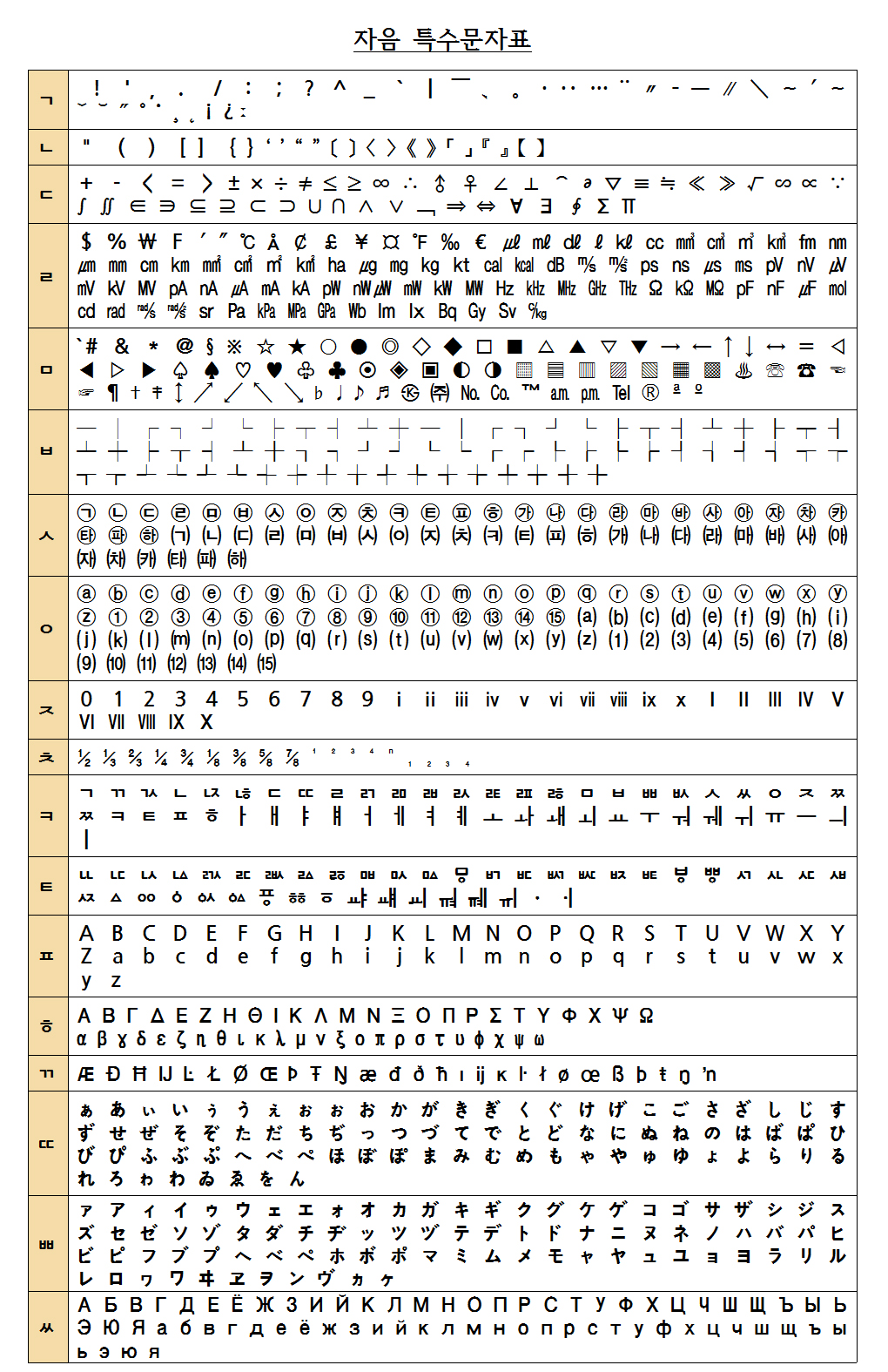 여기서 특수문자를 넣는 방법은 자음을 하나 작성한 다음 키보드의 한자 버튼을 클릭하면 됩니다. 아래에 자음 특수문자표를 참고하시면 됩니다.