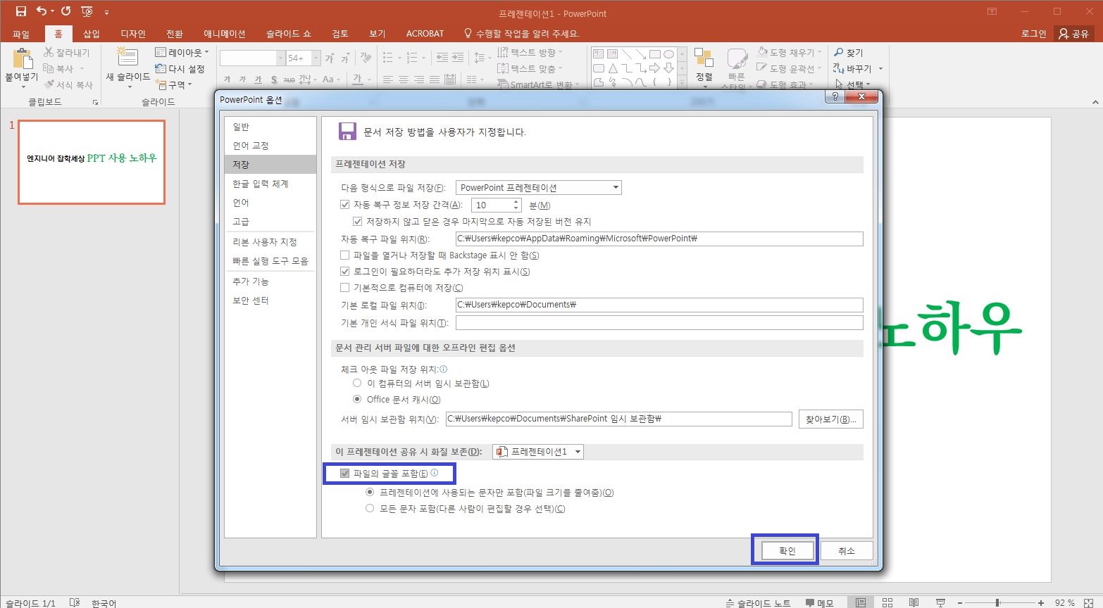 마지막으로 [파일에 글꼴 포함] 체크박스를 선택한 다음에 확인을 클릭하면 저장할때 글꼴을 포함하게 됩니다.