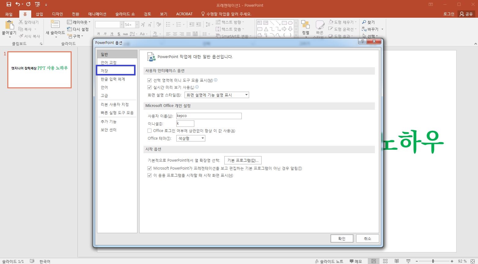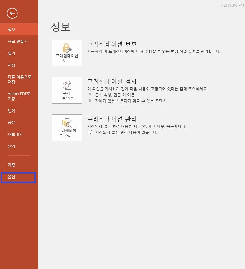 Powerpoint 옵션 창에서 왼쪽 탭 중 [저장]을 클릭하시면 됩니다.