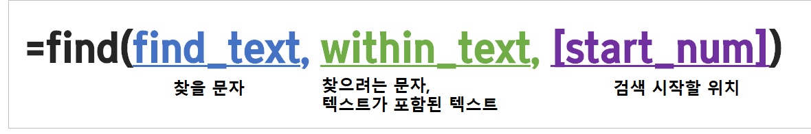 먼저 find 함수 인수에 대한 설명부터 시작해 보겠습니다. 먼저 첫 번째 인수인 find_text는 찾을 문자를 넣어줘요. 두 번째 인수는 첫 번째 인수의 찾을 문자에서 찾으려는 문자 즉 첫번째 인수에 포함된 텍스트를 넣어주면 됩니다. 마지막 옵션은 선택사항인데 검색을 시작할 위치를 넣으면 됩니다. 기본값은 1이에요.