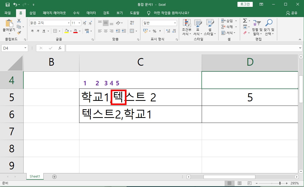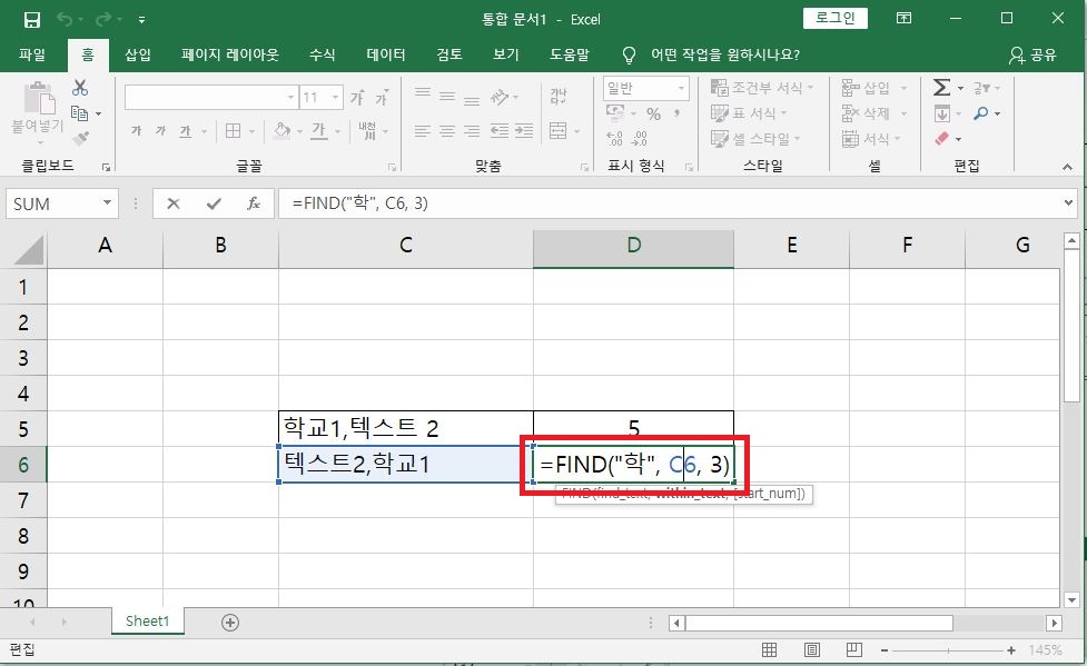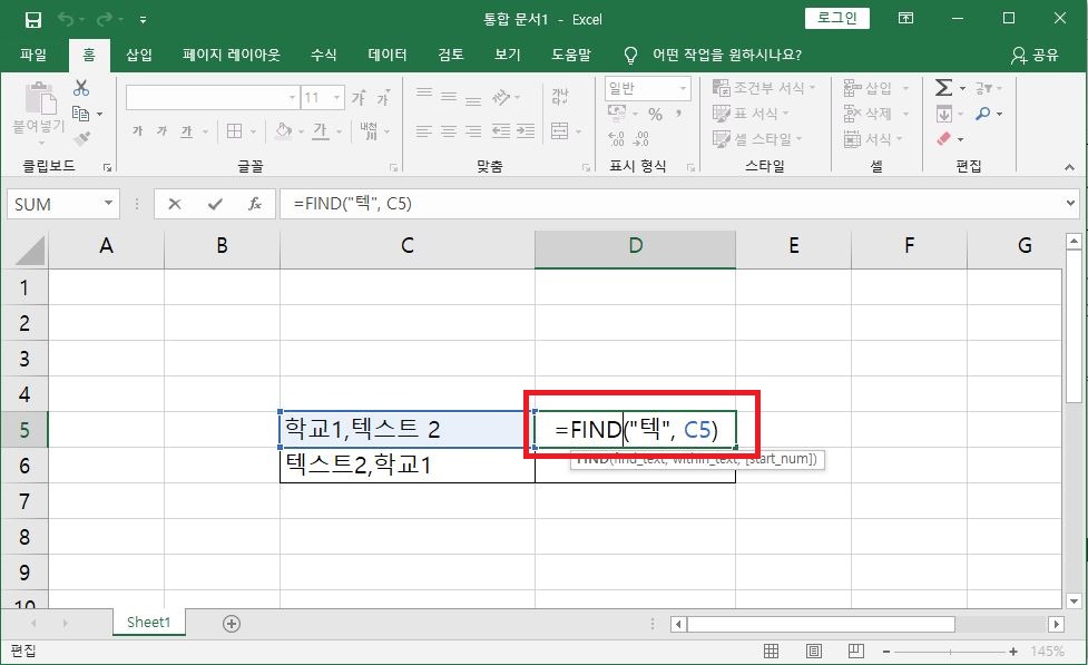 본격적으로 find 함수를 사용해 보겠습니다. 첫 번째 인수로 "텍"을 넣고 두 번째 인수로 C5 셀을 선택했어요. "학교 1, 텍스트 2"에서 "텍"의 글자 위치를 찾아보는 것입니다.