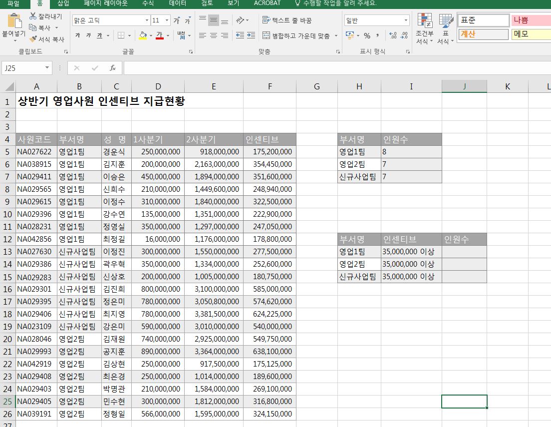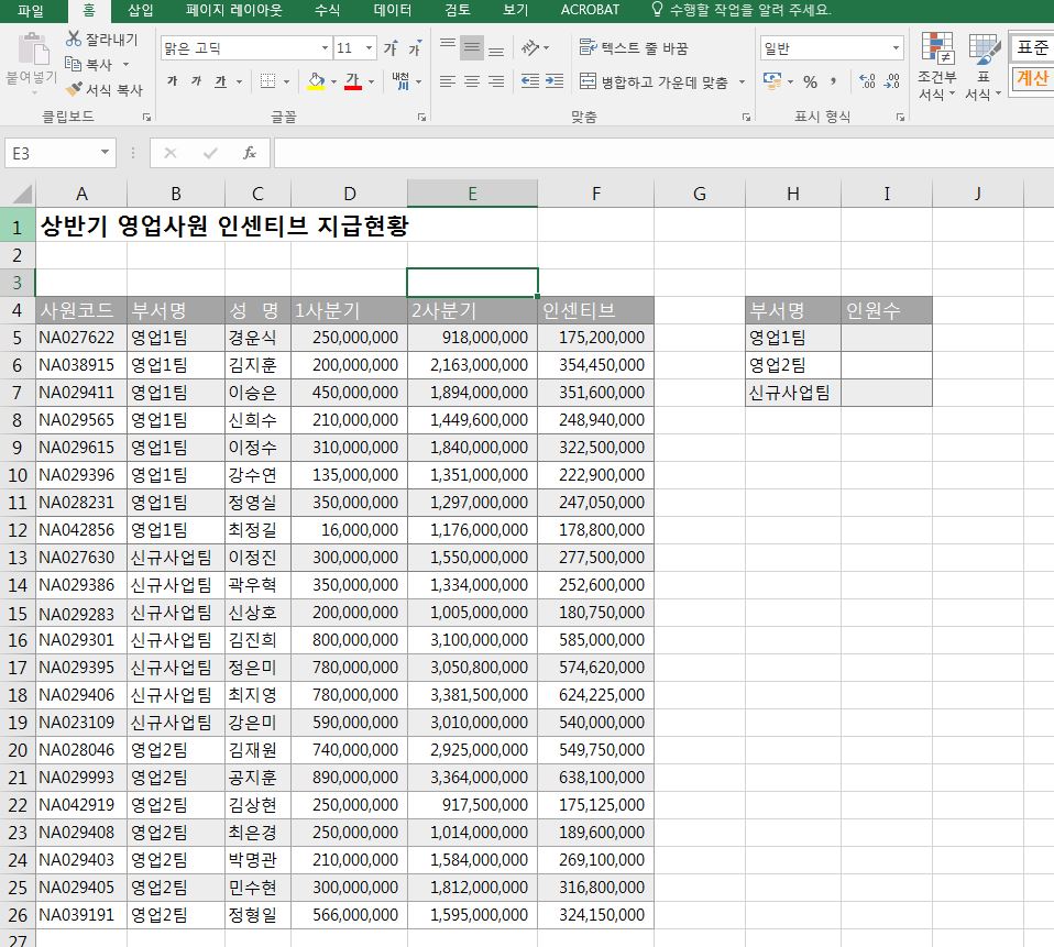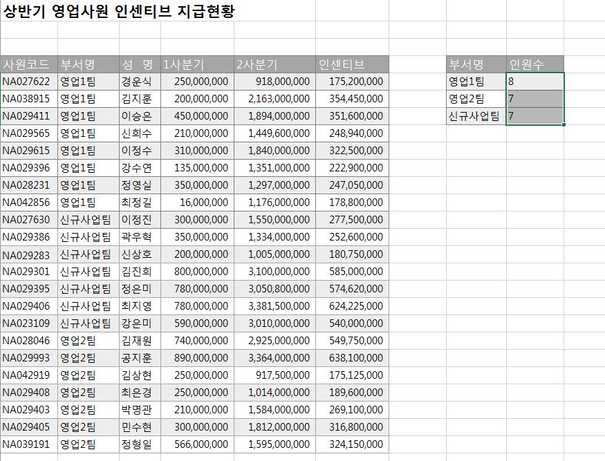 먼저 countif 함수 사용방법에 대해서 알아보겠습니다. 아래 그림을 보시면 상반기 영업사원 인센티브 지급 현황이 나오고 오른쪽에 작은 표를 보실 수 있습니다. ncountif 함수를 이용해 각 부서에 해당하는 인원수를 알아보고자 합니다.