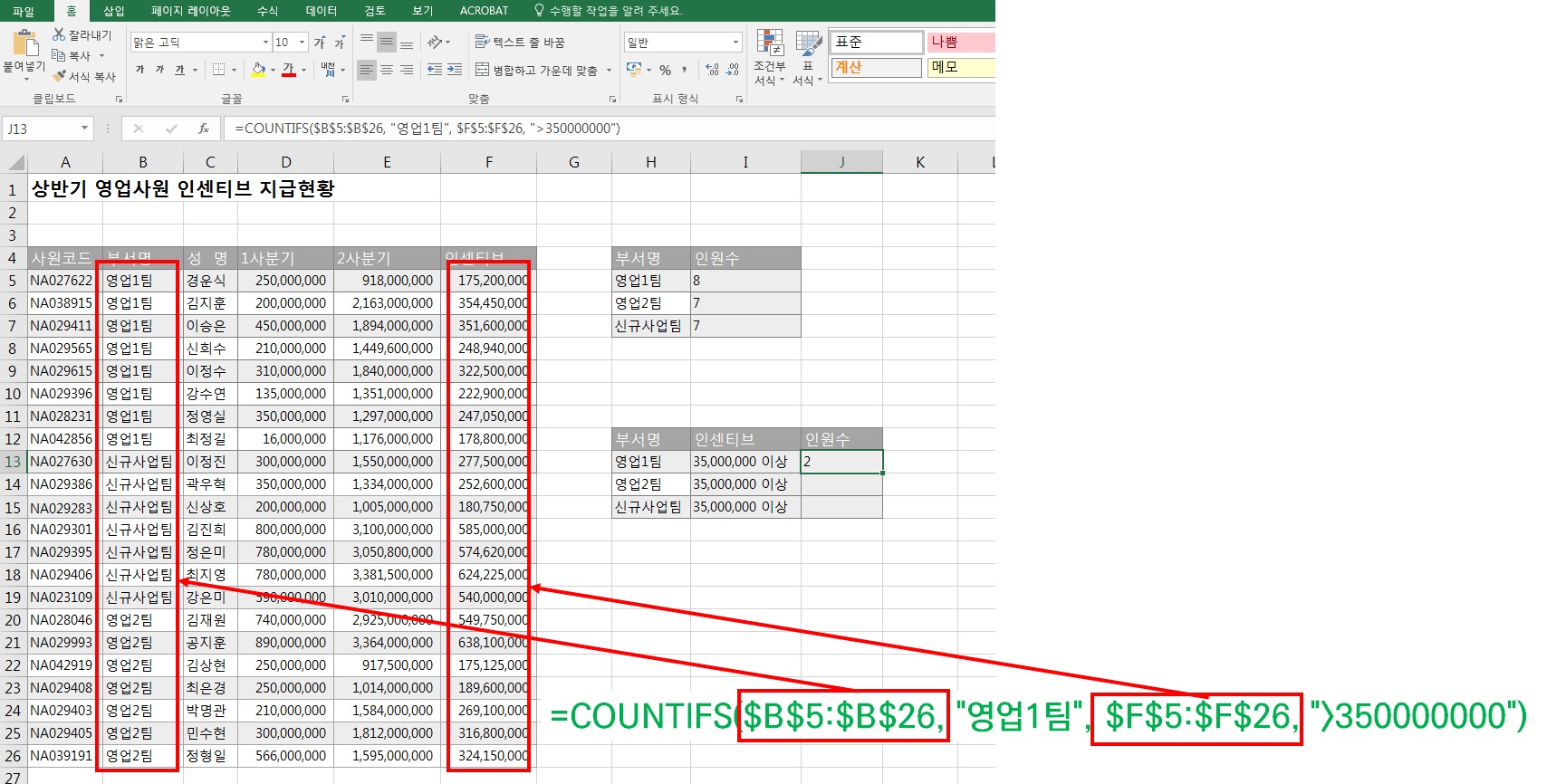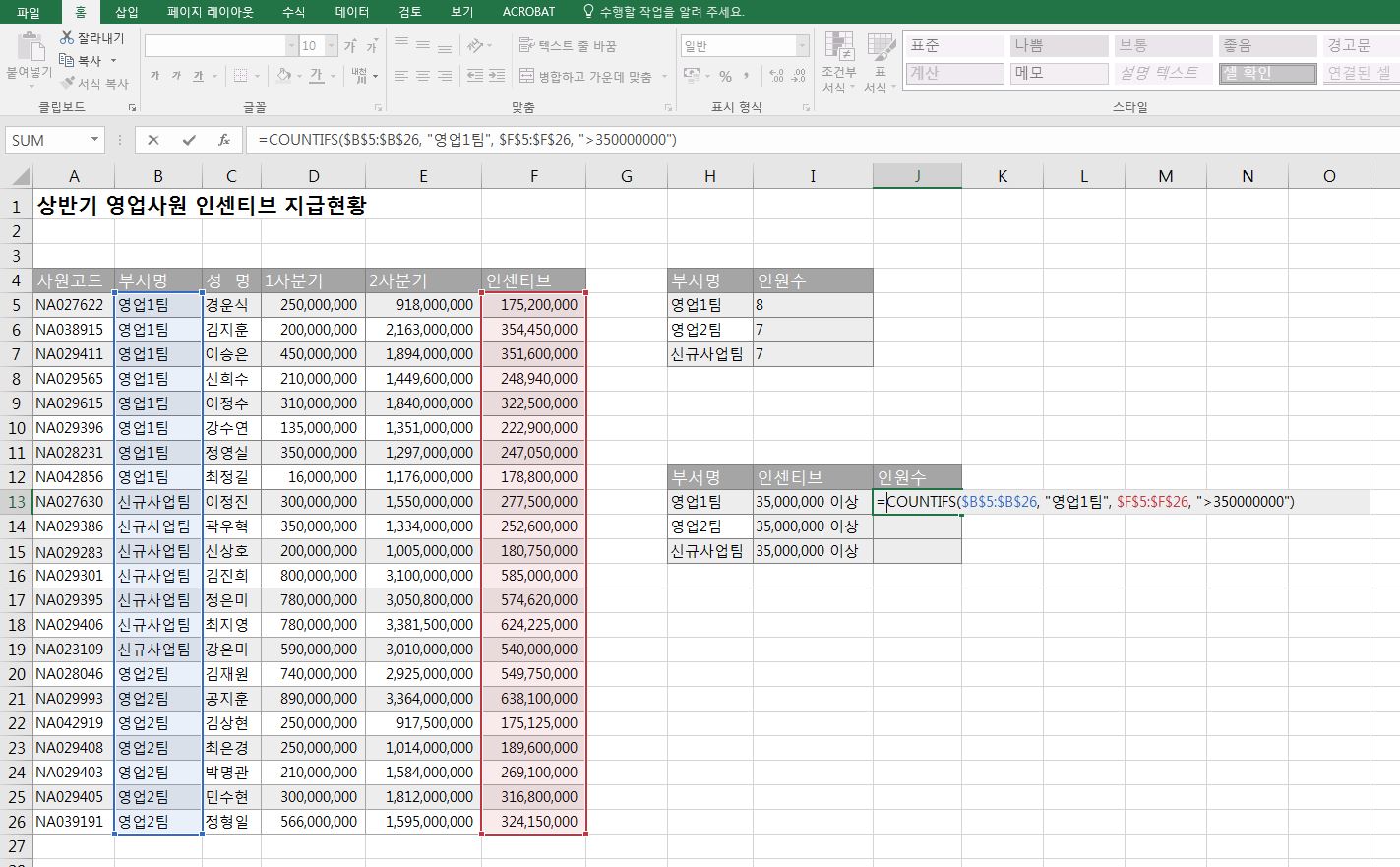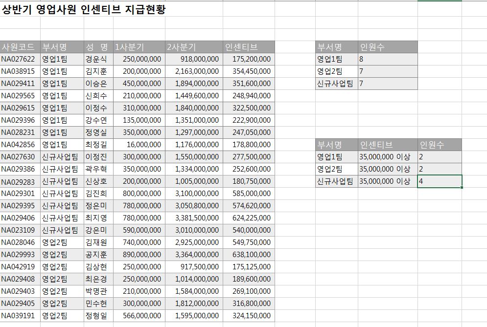 세 번째 인수에는 인센티브 열을 선택해 주시고 네 번째 인수에는 ">35000000"를 넣어주면 영업 1팀 중 인센티브가 35,000,000 이상인 인원에 대한 인원수를 얻을 수 있습니다.