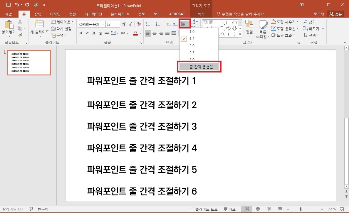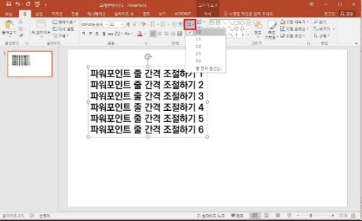 파워포인트 상단의 메뉴에서 [홈]에서 아래 이미지 위치를 클릭하면 1.0, 1.5, 2.0, 2.5, 3.0, 줄 간격옵션 선택이 있습니다. 1.5를 먼저 선택해 보겠습니다.