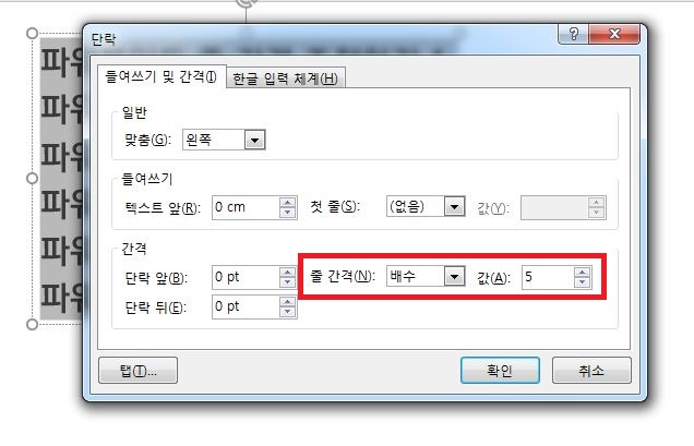 배수 단위로도 줄 간격을 조절할 수 있어요. 마찬가지로 단락 상자에서 줄 간격을 배수로 선택해주세요. 그리고 값을 5로 입력해 볼게요.