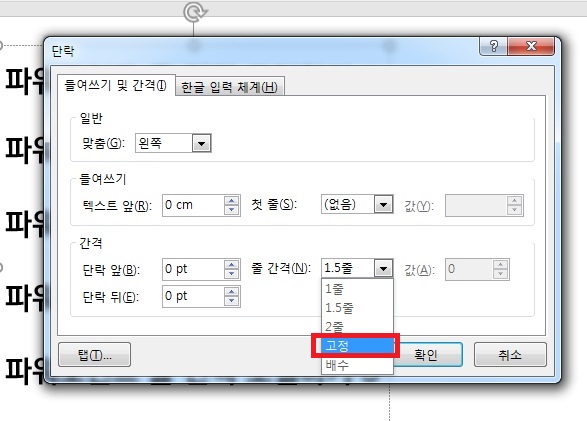 줄 간격 콤보상자에서 고정을 선택해주세요.